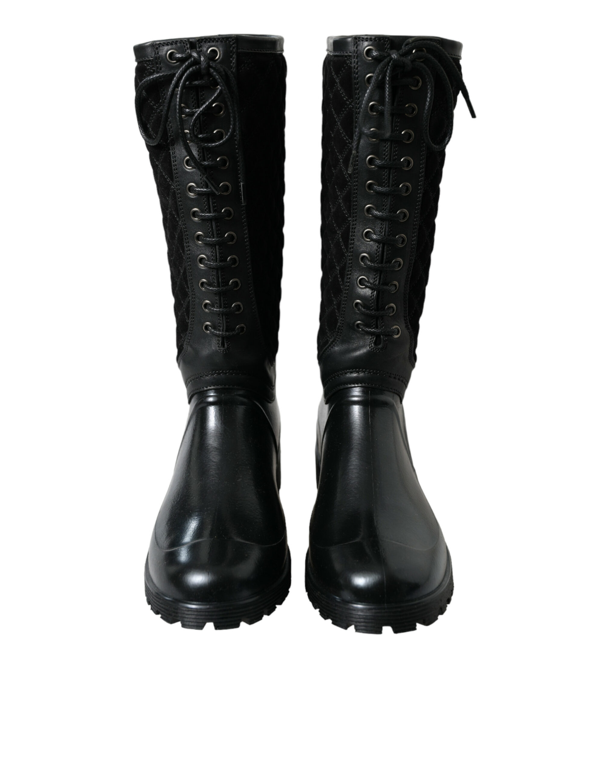 Absolut atemberaubend, 100% authentisch, brandneu mit Tags Dolce & Gabbana Lace up regen Stiefel verfügt über eine Gummi-Obermaterial, gesteppte Bein in Wildleder Kalbsleder und Leder, gepolsterte gesteppte Satinfutter, Gummi Wildleder Kalbsleder und Leder.